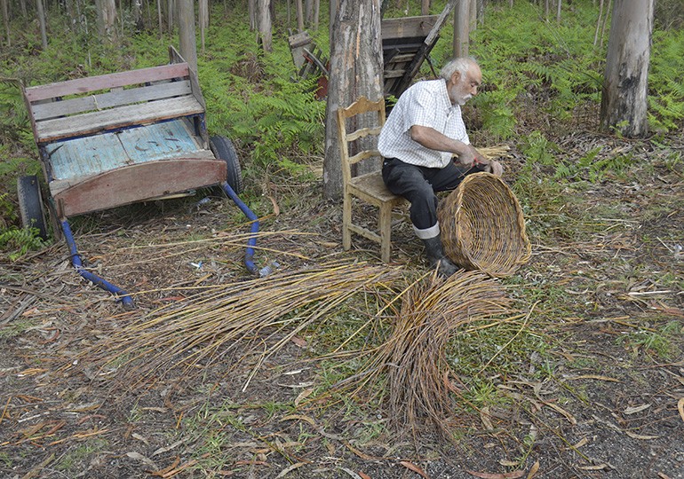 Na cestaria usa vimes que os agricultores lhe trazem, de vários tamanhos e grossuras consoante a peça a ser feita. A alguns tira a casca com o seu inseparável canivete, até exibirem o interior branco para fazer “cestos para aquelas mulheres mais ricas”.