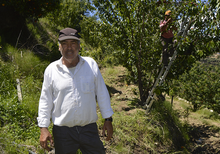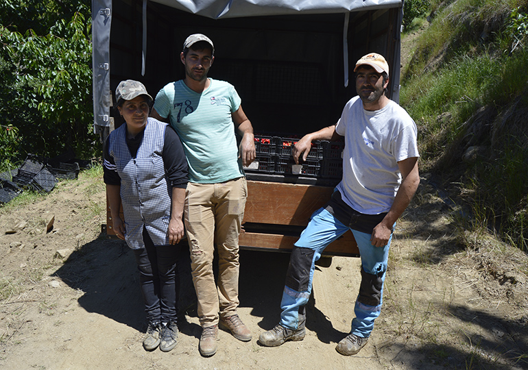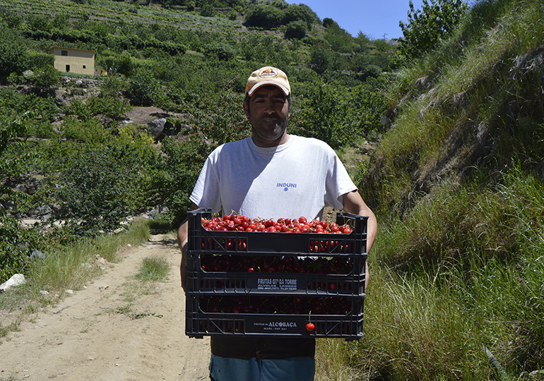 Fomos encontrar atarefados na apanha da cereja, Rogério Silva, Olga Silva e Ivo Cardoso, que nos indicaram que o patrão estava mais abaixo. Ali perto Rogério Silva (pai), ajudava como podia o seu empregado António Lopes, que amontoado numa escada colhia os frutos valentemente. O patrão não tirava os olhos do ajudante e recortava a nossa conversa com avisos ao ajudante “O homem arranja a escada que ainda cais”. Disse-nos amargurado que este ano vão ficar por colher cinco toneladas por não arranjar mão de obra, ainda há dias um curso de formação financiado lhe levou alguém que lhe faz falta. Ainda se lembra das águas da Ribeira de Bertança, que por ali desce, ter trutas que se pescavam com muita facilidade, quase à mão. Não nos deixou vir embora sem nos oferecer uma caixa da boa cereja.